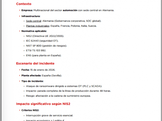 Este documento presenta un caso de uso sobre un incidente teórico de ciberseguridad ocurrido en una planta industrial en España perteneciente a una multinacional alemana. Se describe el ataque de ransomware que afecta a sistemas OT, su impacto operativo y regulatorio, y las obligaciones de notificación bajo NIS2, así como la respuesta técnica y organizativa […]