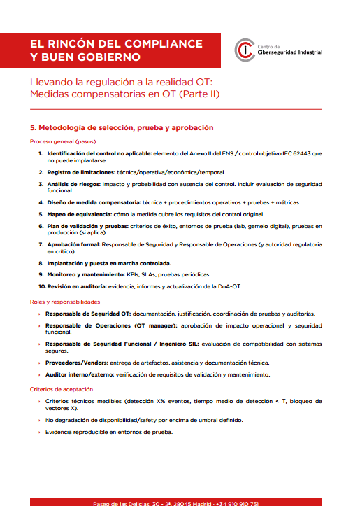 El 30º documento del «Rincón del Compliance y Buen Gobierno» se explica cómo aplicar en la práctica los requisitos normativos del ENS y la norma IEC 62443 en entornos de tecnología operacional. El documento describe una metodología clara para identificar controles no aplicables, analizar riesgos y diseñar medidas compensatorias que garanticen niveles equivalentes de seguridad. También define los roles y responsabilidades de los distintos actores, los criterios de validación y los indicadores de éxito. Finalmente, presenta un catálogo técnico de medidas habituales, como la segmentación de red, las DMZ industriales, el parcheo virtual, la monitorización pasiva, el control de accesos o la gestión de parches, orientadas a mantener la seguridad sin comprometer la disponibilidad ni la seguridad funcional de los sistemas OT.