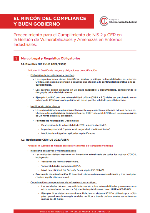 El 31º documento del «Rincón del Compliance y Buen Gobierno» aborda la transposición de las Directivas europeas NIS 2 (UE 2022/2555) y CER (UE 2022/2557) las cuales establece nuevas obligaciones para la gestión de vulnerabilidades y amenazas en entornos industriales, reforzando la resiliencia y la continuidad operativa de los operadores de servicios esenciales y entidades críticas.