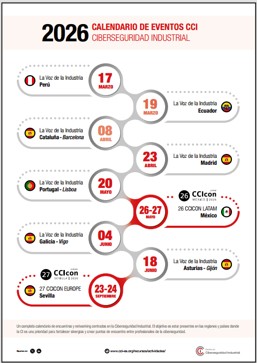 Ya está disponible nuestro Calendario de Eventos CCI 2026, un recorrido internacional por los principales ecosistemas industriales donde la ciberseguridad es estratégica. Este año reforzamos nuestra presencia en Latinoamérica, Europa y varias regiones clave de España.