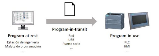 Program-in-transit. Es el momento en el que el programa es transferido al dispositivo industrial a través de algún medio de comunicación. La transferencia del programa puede realizarse a través de la propia red corporativa a la que se encuentre conectado el ordenador origen, ser trasladado mediante un dispositivo de almacenamiento USB a un puesto de máquina desde donde se realizará la transferencia, o a través de la conexión directa del ordenador al dispositivo mediante un puerto serie, entre otros.